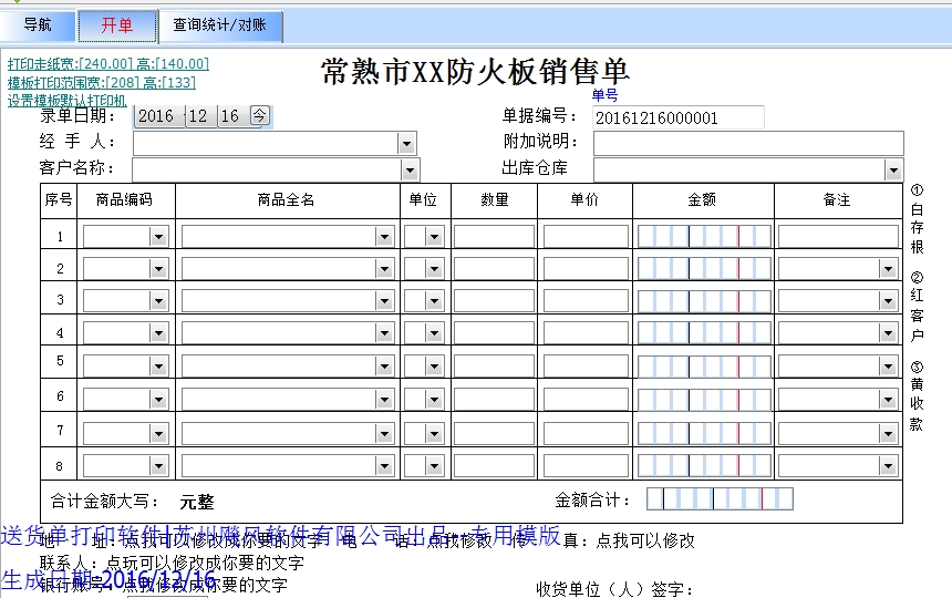 | 客户名称: 经 手 人: 录单日期: 商品编码 序号 数量 单价 金额 合计金额大写: 金额合计: 根 ② 户 ① 红 客 白 ③ 黄 备注 存 收 常熟市XX防火板销售单 单位 1 2 3 4 5 出库仓库: 地 址:点我可以修改成你要的文字 电 话:点我修改 传 真:点我可以修改 联系人:点玩可以修改成你要的文字 单据编号: 商品全名 6 7 款 8 附加说明: 银行账号:点我修改成你要的文字 收货单位(人)签字: 制 单 人: 出库经手人: | ||||||||||